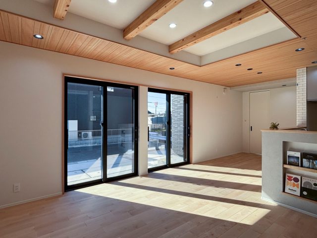 LDKは無垢の床や天井の木調パネル、化粧梁など、木の温かみを感じられる空間です。