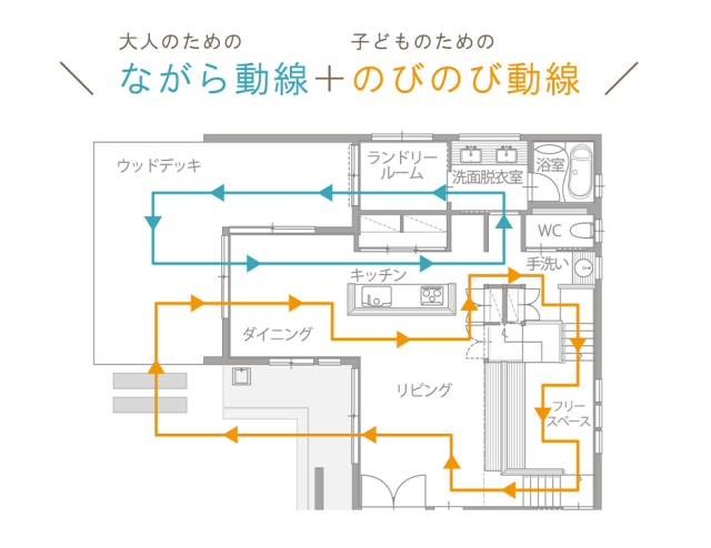 大人のための「ながら動線」と子どものための「のびのび動線」に加え、子どもたちがのびのびと