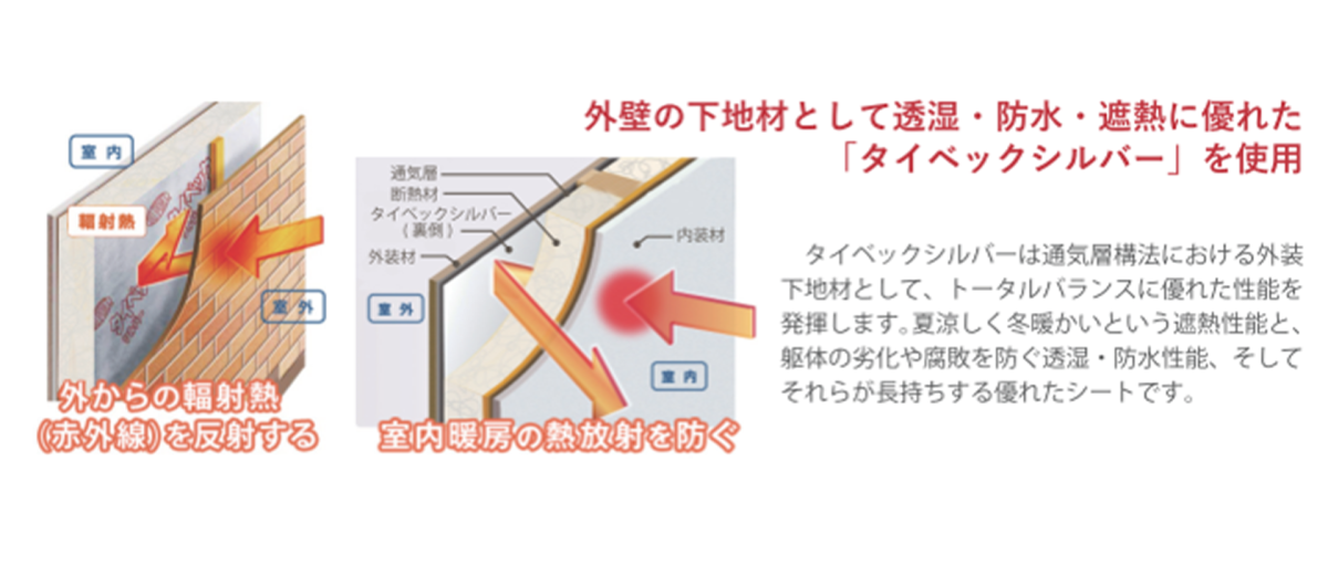 「基礎パッキン工法」により、床下の湿気を排出して理想的な床下環境をつくりだすことで、腐朽菌やシロアリの発生を未然に防ぎます。壁の中には「外気通気層」と呼ばれる空気の通り道を設けることで湿気を屋外に排出し、住まいの耐久性を高めています。外壁の下地材には「タイベックシルバー」を採用。夏涼しく冬暖かいという遮熱性能と、躯体の劣化や腐敗を防ぐ透湿・防水性能をもち、さらにその機能が長持ちするという優れた下地材です。