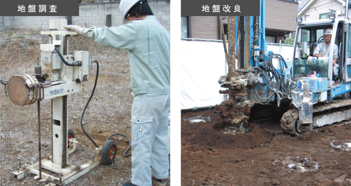 建物の重みによって地盤が沈下してしまう「不同沈下」を回避するために、地盤の強さを専門機器で徹底的に調べます。敷地に不同沈下の危険性がないか、地盤調査や敷地周辺の環境調査をあらかじめしっかりと実施。そのうえで基礎づくりに入ります。 軟弱地盤の場合はその強さに適した地盤補強を行うことで、地耐力を確保しています。