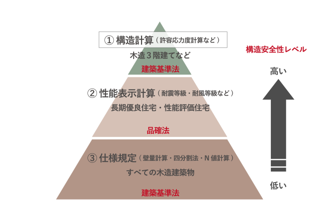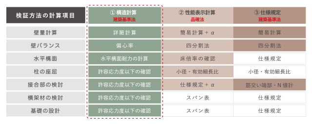 3.の「仕様規定」は建築基準法で定められた規定に則ったものです。もっとも一般的かつ多くの会社が採用していますが、壁量・壁バランス・接合部の検討などを簡易的な計算と仕様・ルールに則って耐震性を確保しているにすぎません。2.の「性能表示計算」は壁量・配置バランス・床倍率・接合部・基礎・横架材のチェックがありますが、簡易計算によるもので、基礎や横架材はスパン表を用いるだけです。対して1.の「許容応力度計算」は、力の伝達を確認して、部材ごとの応力を求め、その安全性を確認していく方法で、より安全な計算方法といえます。性能表示計算と許容応力度計算の違いを一番シンプルに言うならば、「必要な耐力壁の量」の違いです。許容応力度計算の方がより多くの耐力壁が必要になります。耐力壁以外にも、それぞれの検証方法について細かい計算項目があります。